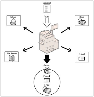 If you press [Scan and Send] on the Main Menu screen, the Scan and Send Basic Features screen appears. The Send function enables you to scan documents and send them to specified destinations via e-mail or I-fax, save them to a file server, or store them in a mail box to process them at a later date. You can send documents to multiple destinations simultaneously using various sending methods, such as e-mail and I-fax.