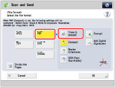 If you select [Trace & Smooth] as the PDF file format, [Compact] is automatically set to 'On'. You can also set [OCR (Text Searchable)]. [Trace & Smooth] cannot be set by itself.