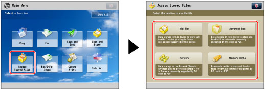 To print a stored file, press [Access Stored Files] on the Main Menu screen → specify the location where the desired file is stored.