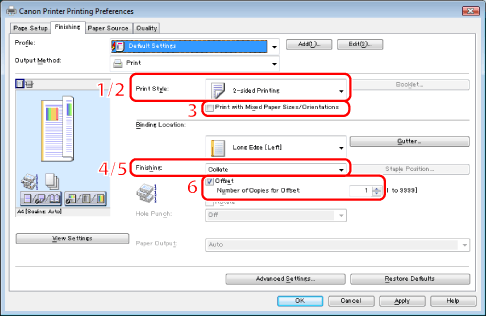 Prints on one or both sides of the paper. The default setting for [Print Style] is [2-sided printing] (see "1-sided and 2-sided Printing").