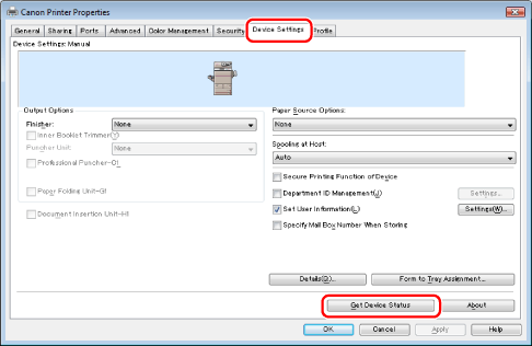 If you are using a shared printer, you need to install Canon Driver Information Assist Service in the print server computer in order to use the [Get Device Status] function. For details about how to install the Canon Driver Information Assist Service, see the Printer Driver Installation Guide (see "Installation").