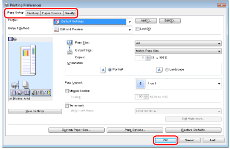 Click the tabs for the [Page Setup], [Finishing], [Paper Source], and [Quality] tabs, and then specify the desired items.