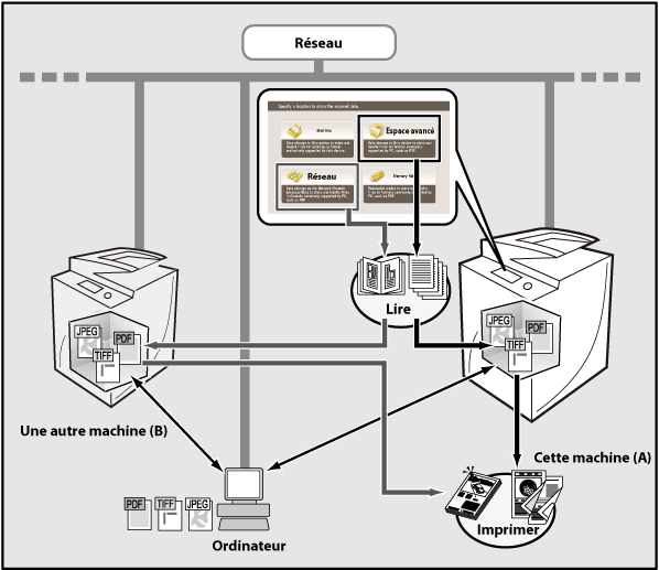 L'Espace avancé de l'imageRUNNER ADVANCE est un emplacement de stockage pour partager des informations. Il permet de transmettre des informations sans support papier en y stockant des documents numérisés auxquels les utilisateurs peuvent accéder depuis leurs PC.