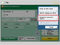 Quatre raccourcis des options sont affichés dans l'écran des fonctions de base du mode Fax. Les options définies par défaut sont [Densité], [Type d'original], [Original recto verso] et [Mélange d'originaux]. Ces raccourcis peuvent être modifiés pour des fonctions utilisées fréquemment.