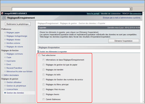 Il est également possible de vérifier les derniers résultats d'importation/exportation en appuyant sur [Gestion des données] sous <Réglages de gestion> → [Résultats d'Importation/Exportation].