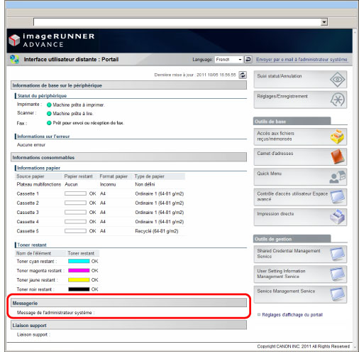 La Messagerie est une fonction que l'administrateur utilise pour communiquer des messages aux utilisateurs de cette machine en les affichant sur l'interface utilisateur distante ou sur l'afficheur tactile. La définition des réglages de messagerie et la création de messages s'effectuent à partir de l'interface utilisateur distante.