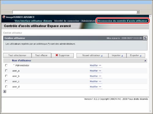 Cliquer sur [Déconnexion du contrôle d'accès utilisateur] pour terminer l'opération. Si l'on ferme la page du navigateur Web sans cliquer sur [Déconnexion du contrôle d'accès utilisateur], le processus de déconnexion ne sera pas effectué correctement. Le cas échéant, noter qu'il sera impossible de se reconnecter pendant environ 30 minutes.