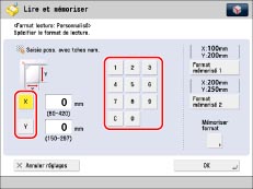 Appuyer sur [X] ou [Y] → saisir le format de lecture en mm.