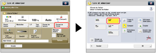 Si le format de fichier PDF sélectionné est [Tracer & Lisser], le mode couleur passe de [Auto (Coul./Noir)] et [Noir et blanc] à [Auto (Coul./Gris)] et [Niveaux de gris]. Pour lire le document avec le mode couleur spécifié, il faut sélectionner un format de fichier PDF autre que [Tracer & Lisser] et [Compact].