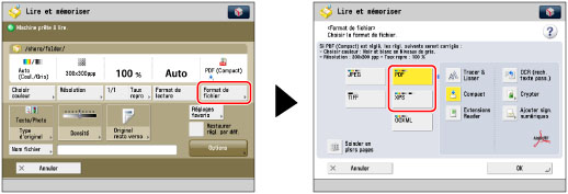Si le format de fichier PDF ou XPS sélectionné est [Compact], le mode couleur passe de [Auto (Coul./Noir)] et [Noir et blanc] à [Auto (Coul./Gris)] et [Niveaux de gris]. Pour lire le document avec le mode couleur spécifié, il faut sélectionner un format de fichier PDF ou XPS autre que [Compact] et [Tracer & Lisser].