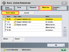 Annule la tâche sélectionnée. [Annuler] s'affiche si une tâche est sélectionnée. Appuyer sur [Annuler] → [Oui] pour annuler la tâche.