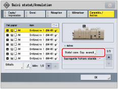 Si l'espace avancé est ouvert au public via SMB et que l'option [Utiliser SMB] sous [Préférences] (Réglages/Enregistrement) est réglée sur "Oui", les clients connectés à l'imprimante SMB sont également affichés et comptabilisés comme clients connectés. Pour plus d'informations sur le réglage de l'espace avancé à ouvrir au public via SMB ou WebDAV, voir "Réglages Espace avancé/Réseau".