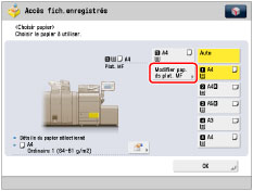 Il est possible de mémoriser des types de papier ne figurant pas dans la liste des réglages détaillés dans <Modif. papier plateau multifonctions: Type papier>. Pour plus d'informations sur la mémorisation du type de papier, voir "Mémorisation/modification des types de papier personnalisés".