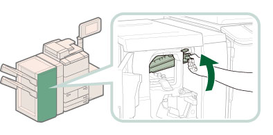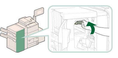 Prendre garde lors de la manipulation de l'équipement en option installé sur la machine. Lorsque le capot d'une unité en option est ouvert pour remplacer une cartouche d'agrafes, jeter des résidus de perforation ou de coupe, retirer les agrafes usagées ou éliminer des bourrages de papier ou d'agrafes, l'impression de documents peut se poursuivre si d'autres unités en option fonctionnent normalement et ne sont pas concernées par la procédure d'élimination de bourrages papier ou d'agrafes.