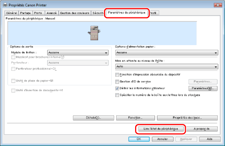 Si l'imprimante et l'ordinateur sont connectés via un port USB ou WSD (Web Services on Devices, services Web sur périphériques), la fonction [Lire l'état du périphérique] n'est pas disponible. Il est nécessaire de configurer les paramètres manuellement.
