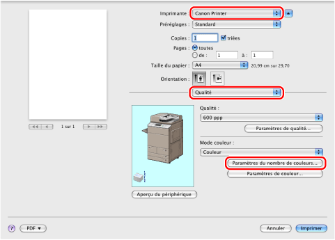 Sélectionner l'imprimante → [Qualité] → cliquer sur [Paramètres du nombre de couleurs].