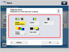 Se [Utilizzo Autom. (Colore/Nero)] in [Selezione impostazioni colore per copia] è impostato su 'Off', [Autom. (Colore/Nero)] non viene visualizzato. (Vedere "Limitazione dell'uso della selezione colore automatica".)