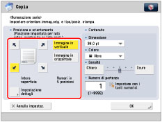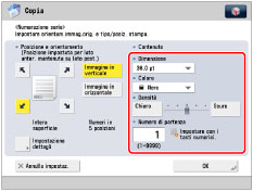 Se [Opzione numero] viene impostato su 'On', [Intera superficie] e [Numeri in 5 posizioni] è ombreggiato e non può essere selezionato. (Vedere "Impostazione della funzione di numerazione serie".)