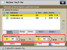 Se si imposta 'Off' per <Blocco in memoria fax> e/o <Blocco in memoria I-Fax>, i file ricevuti con la funzione fax/I-fax vengono stampati automaticamente ed eliminati dalla mailbox RX memoria.