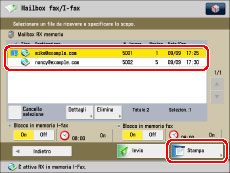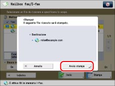 Se si imposta 'Off' per <Blocco in memoria fax> e/o <Blocco in memoria I-Fax>, i file ricevuti con la funzione fax/I-fax vengono stampati automaticamente ed eliminati dalla mailbox RX memoria.