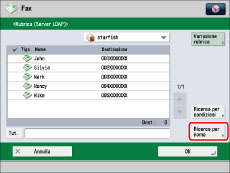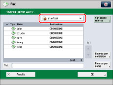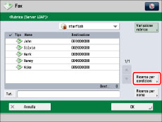 Il numero dei risultati di ricerca visualizzati non supera il limite massimo impostato in [Registrazione server LDAP]. Se non viene visualizzata la destinazione desiderata, aumentare il numero massimo di indirizzi da cercare o variare il criterio di ricerca. (Vedere "Registrazione di un server LDAP".)