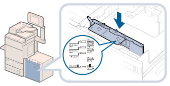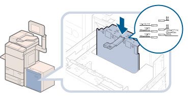 Verificare di allineare correttamente la piastra di modifica del formato esterna con i segni corrispondenti al formato della carta desiderato. Esistono due posizioni con segni corrispondenti al formato della carta nella parte superiore della piastra di modifica del formato esterna. Allineare la piastra di modifica del formato esterna con i segni desiderati.