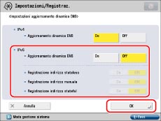 Se <Utilizzo DHCPv6> è stato impostato su 'On' al punto 7, il nome di dominio impostato manualmente viene sovrascritto. Anche se si imposta <Utilizzo stesso nome host/nome dominio di IPv4> su 'On', viene utilizzato il nome di dominio ottenuto dal server DHCPv6.