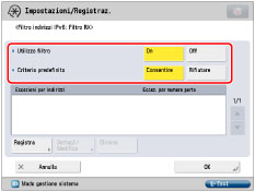 Se si tenta la trasmissione o la ricezione tra la periferica avente l'indirizzo/numero di porta IPv6 impostato per essere rifiutato, e la macchina, verrà generato un registro degli indirizzi IP ai quali è stato negato l'accesso. Per visualizzare il registro dei bloccati, "Controllo del registro di indirizzi IP bloccati".