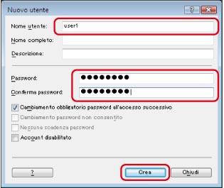 Nella finestra di dialogo [Nuovo utente], immettere il nome utente in [Nome utente] → immettere la password in [Password] → immettere nuovamente la password in [Conferma password] → fare clic su [Crea].