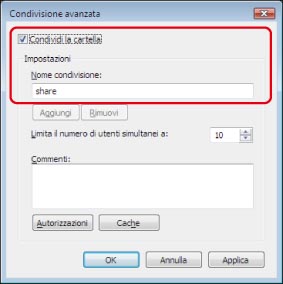 Nella scheda [Condivisione], selezionare [Condividi la cartella] → immettere il nome di condivisione in [Nome condivisione].