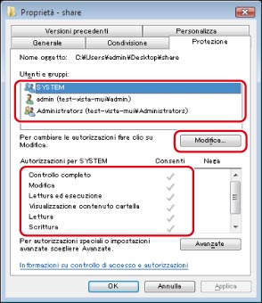 In ambiente Active Directory, le procedure di specifica delle impostazioni relative alla protezione della cartella condivisa sono diverse da quelle indicate sopra. Per ulteriori informazioni, consultare il manuale di Windows.