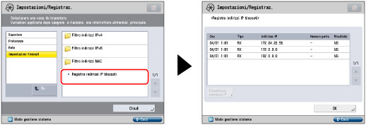 Quando sono stati impostati degli indirizzi IP per bloccare la trasmissione e la ricezione dati verso e dalla macchina, e si effettua un tentativo di trasmissione/ricezione tra la macchina e le periferiche con tali indirizzi, verrà memorizzato un registro di indirizzi IP bloccati. Inoltre, viene registrato il registro di indirizzi IP bloccati e dei numeri di porta bloccati quando si trasmettono dati.