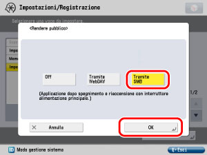→ [Impostazioni funzione] → [Memorizzazione/Accesso a file] → [Impostazioni Area di condivisione] → [Rendere pubblico] → [Tramite SMB] → [OK].