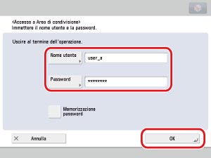 Se come servizio di accesso si utilizza SSO-H, premere [Memorizzazione password] per registrare il nome utente e la password. All'accesso successivo all'Area di condivisione, il nome utente e la password saranno già inseriti. Per visualizzare la schermata di selezione dello spazio è sufficiente premere [OK]. Se la schermata di collegamento non viene visualizzata, questa operazione non è necessaria.