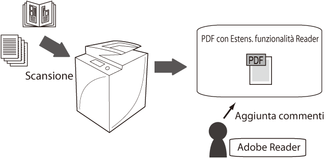 Selezionando il modo Estens. funzional.Reader durante la trasformazione di un documento cartaceo in un file PDF, è possibile aggiungere/modificare commenti e aggiungere firme mediante Adobe Reader (Adobe Reader 7 o successivo).