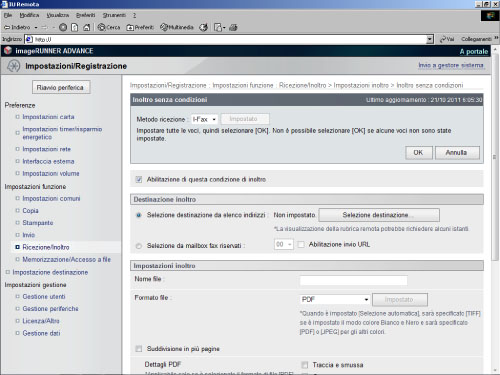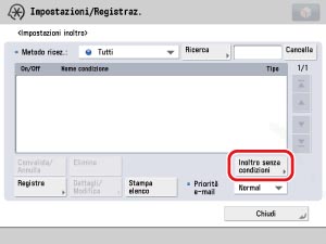 Fare clic su [Inoltro senza condizioni] → indicare il tipo di ricezione, la destinazione di inoltro, l'avviso di fine inoltro e altre impostazioni.