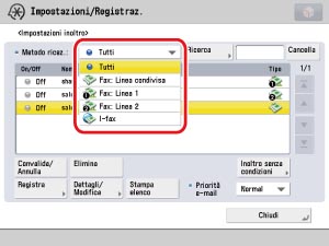 Con la Super G3 2nd Line Fax Board installata è possibile impostare un numero massimo di 1.000 condizioni di inoltro. Questo numero corrisponde a un totale di [Fax: Linea condivisa], [Fax: Linea 1] e [Fax: Linea 2].