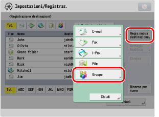 Se si registra un gruppo che comprende più indirizzi e-mail presenti nella rubrica, è possibile inviare una e-mail a tutti gli indirizzi inclusi nel gruppo contemporaneamente selezionando il gruppo come destinazione.