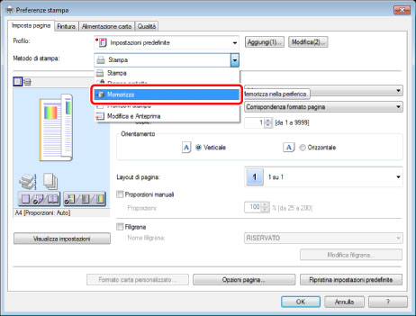 Fare clic sulla voce [File] del software applicativo utilizzato per la stampa del documento → selezionare [Stampa] per visualizzare la finestra di dialogo [Stampa] → fare clic su [Proprietà].