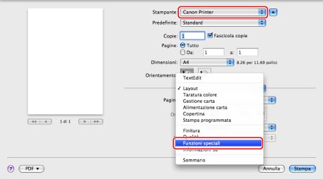Selezionare la stampante da utilizzare → selezionare [Funzioni speciali].