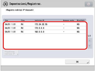 [Impostazioni/Registrazione] → [Impostazioni rete] per <Preferenze> → [Registro indirizzi IP bloccati].