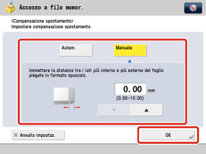 Se la posizione di stampa delle immagini è spostata e si desidera impostare la compensazione dello spostamento, premere [Compensaz. spostamento] → selezionare [Autom.] o [Manuale] → premere [OK].