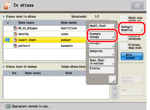 Selezionare il lavoro desiderato dall'elenco lavori in attesa → premere [Dettagli/Modifica] → [Esempio stampa].