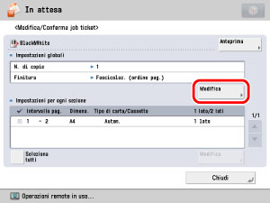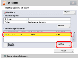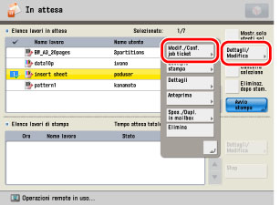 Selezionare il lavoro per il quale è stato eseguito l'esempio di stampa al punto precedente → premere [Dettagli/Modifica] → [Modif./Conf. job ticket].