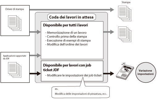 Consente di memorizzare un lavoro inviato nella coda In attesa. Quando il lavoro si trova nella coda In attesa, è possibile selezionarlo dal relativo elenco per stamparlo. Mettendo in attesa un lavoro, è possibile modificare l'ordine dei lavori. Se il lavoro è dotato del job ticket JDF, è possibile controllare e modificare le impostazioni di finitura prima della stampa.