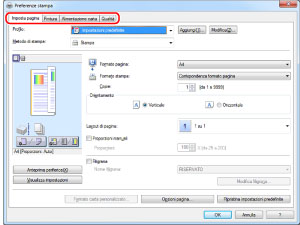 Fare clic sulle schede [Imposta pagina], [Finitura], [Alimentazione carta] e [Qualità] per specificare le impostazioni necessarie.