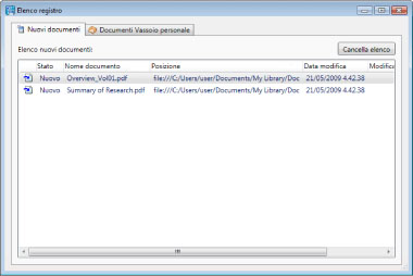 Facendo clic sull'icona di notifica del nuovo documento [Elenco registro] nella finestra di notifica nuovo documento, appare la finestra [Elenco registro]. Nella finestra di dialogo [Elenco registro] fare doppio clic su una voce nell'elenco dei nuovi documenti per lanciare Desktop Browser e visualizzare le voci nella cartella in cui si trova un nuovo documento nel riquadro di visualizzazione elenco file.