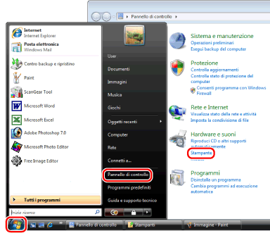 Per Windows XP Home Edition, fare clic su [Start] → [Pannello di controllo] → [Stampanti e altro hardware] → [Stampanti e fax].