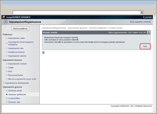 Se la macchina viene spenta, tutti i lavori in fase di elaborazione vengono annullati. Verificare che tutti i lavori siano terminati prima di spegnere la macchina. |