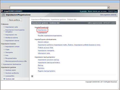 Se si importano le Impostazioni gestione ID divisione quando si utilizza la funzione Importa tutti, le impostazioni delle informazioni del gestore di sistema, come l'ID e la password, sono sovrascritte. Controllare le informazioni del gestore di sistema sulla macchina di esportazione prima di utilizzare la funzione Esporta tutti, poiché sono richieste quando si accede alla macchina di destinazione per l'importazione.